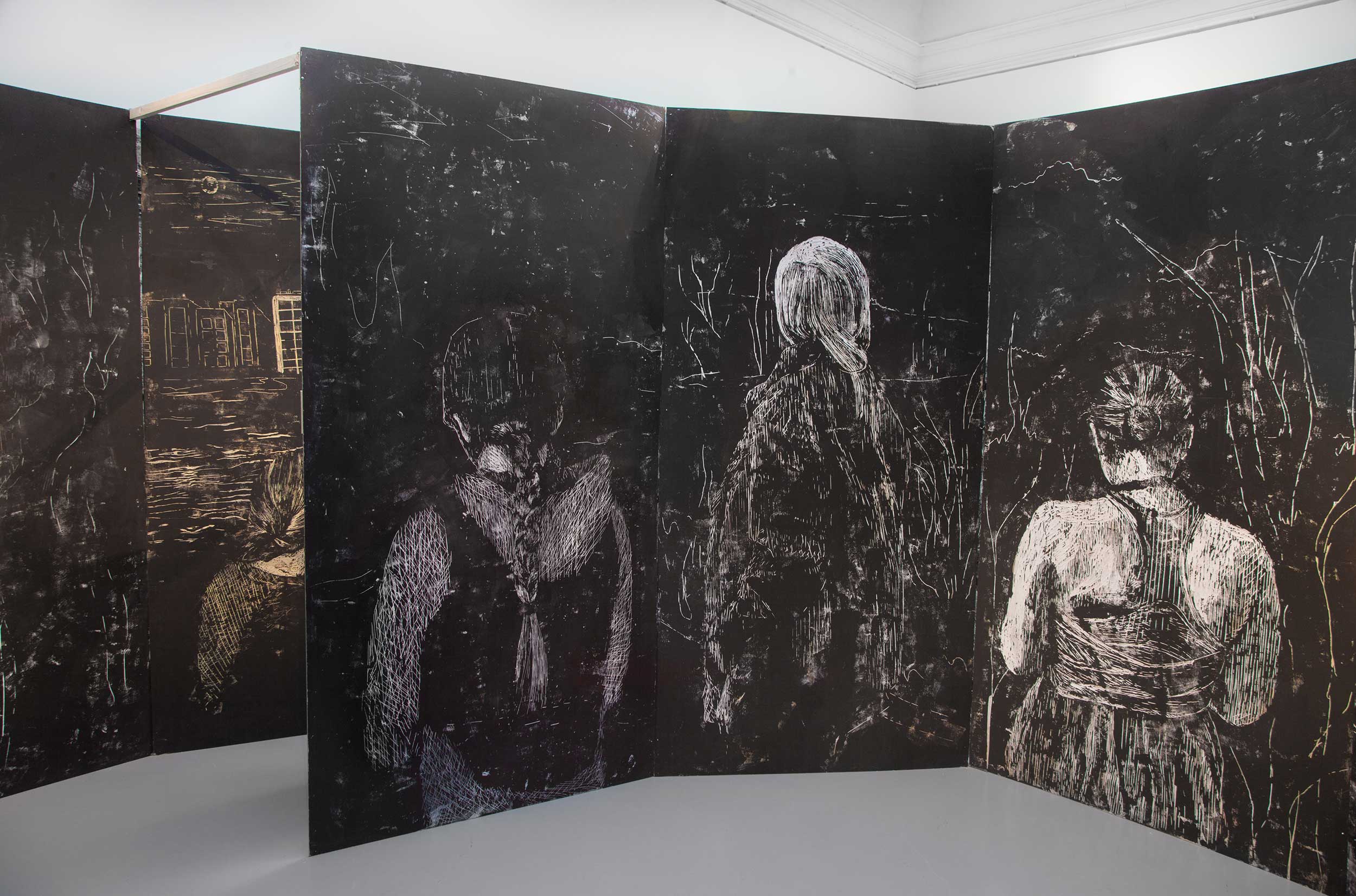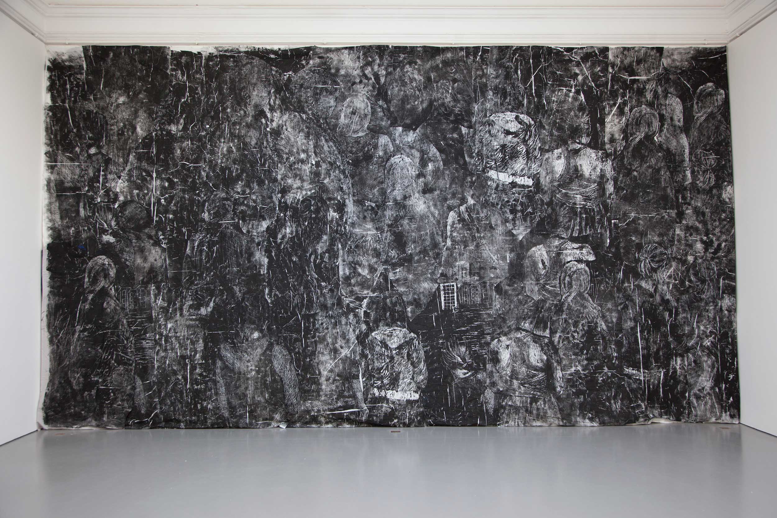 Motiven karvas fram ur stora plywoodskivor, ur det fabriksformat som skivorna levereras i. Det kallas stocken. När stocken är klar trycker jag den på lakan, på golvet i min ateljé. Sedan syr jag ihop många tryck till collage, där tryck från samma stock återkommer flera gånger. I utställningar kombinerar jag ofta collagen med stockarna som använts vid tryckningen. Jag använder alltså både förlagan och representationen.